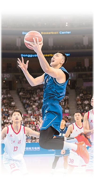 廣東隊球員胡明軒(上)在籃球男子成年組比賽中突破上籃。新華社記者 李 博攝